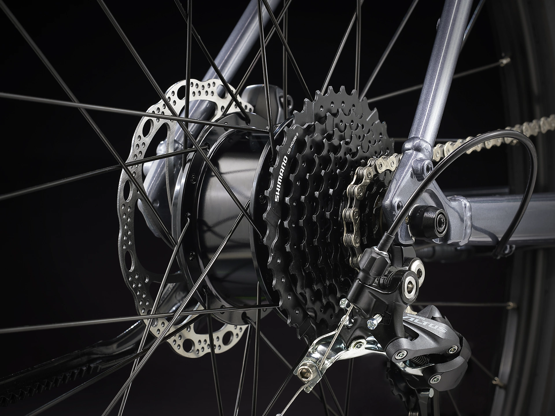 Cuadro ligero de aluminio con diseño stagger para subir y bajar de la bicicleta más fácilmente, sistema de asistencia al pedaleo desarrollado y patentado por Trek con motor en el buje (250 W, 40 Nm) que ofrece una asistencia de hasta 25 km/h y una batería de 250 Wh para disfrutar de una autonomía de hasta 55 kilómetros por carga. Además, incorpora ruedas rígidas de 650b y cubiertas anchas de 50c que aportan capacidad y confort sobre distintos terrenos, una fiable transmisión Shimano de 9 velocidades, frenos de disco hidráulico, luces integradas alimentadas mediante la batería y una pata de cabra.